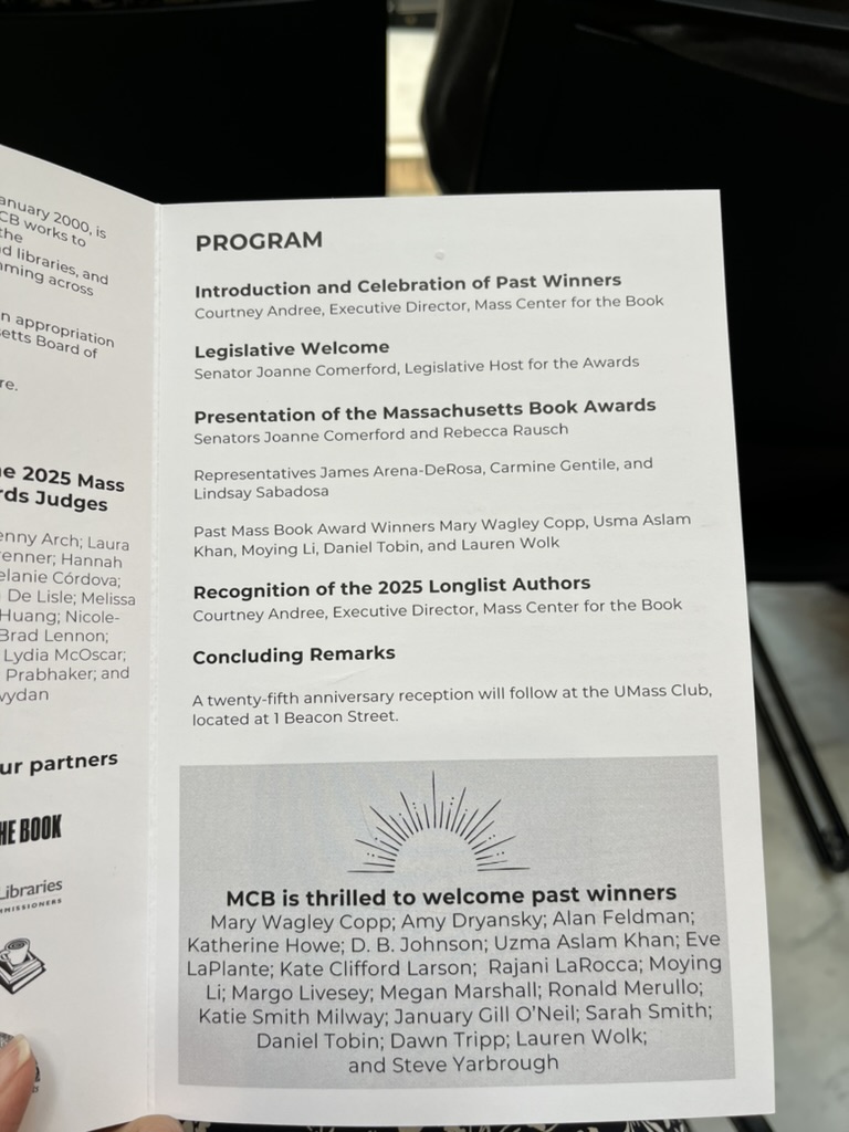 I was truly honored to be invited along with other past and current winners to celebrate the 25th Massachusetts Book Awards at the State House in Boston MA! This year, SONA AND THE GOLDEN BEASTS was a 2025 Massachusetts Must-Read Title!
